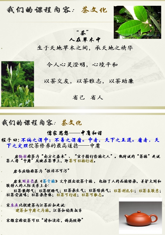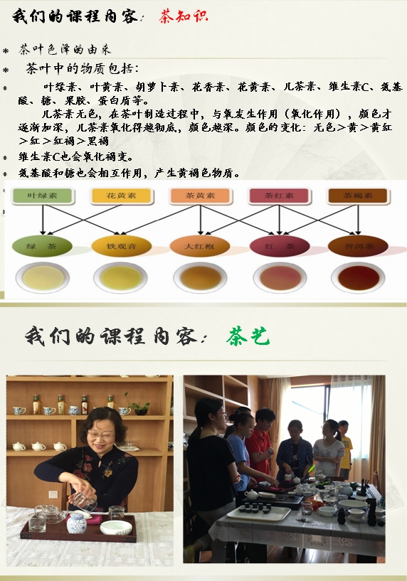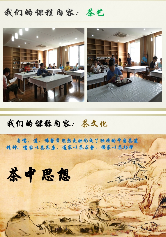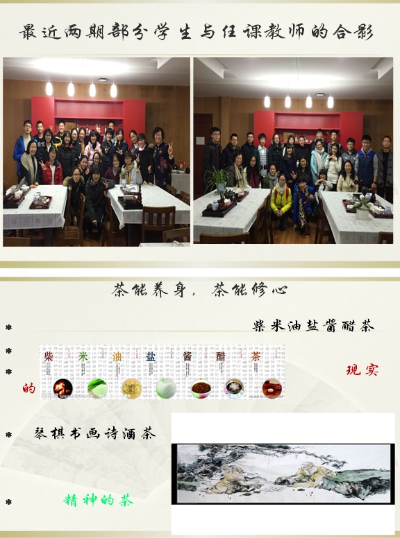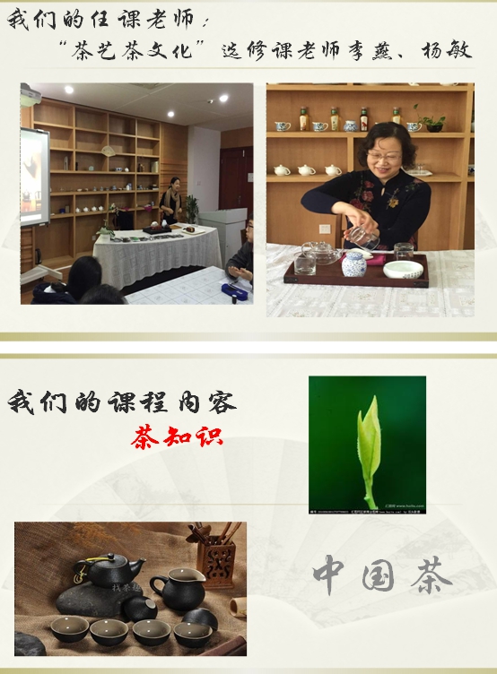 记得那是2012年下半年开学初的一天,我们学校学生精品社团——“国学社”与“聚贤庄”两个社团的社长到老师中间寻找指导教师,他们希望喜欢中国茶的李燕老师能成为他们两个社团一学期的指导教师,那个学期他们社团课程中学习交流的主题是中国茶文化。茶文化就是在那个时候由我们的学生将它带进了我们学校的社团精品课中。没有现成的教材和固定的教与学的模式,李老师把在中级茶艺师课程上学到的东西以及阅读过的关于茶与茶文化的书籍介绍给学生,师生共同学习研讨,大家兴趣盎然。在学习与活动中,学生学习茶艺了解茶知识,追寻一片树叶背后的故事,理解茶艺程式中的礼仪文化,进而更深刻地领会“礼为用”、“形而上者为之道,形而下者为之器”等这些古文化思想的内涵。学生们对茶、茶艺与茶文化的兴趣令老师惊奇亦惊喜。我们开始希望有更多的学生喜欢喝中国茶,学会泡一杯好喝的中国茶,真正了解我们的茶文化内涵,从而成为普及传播中国茶文化的使者。