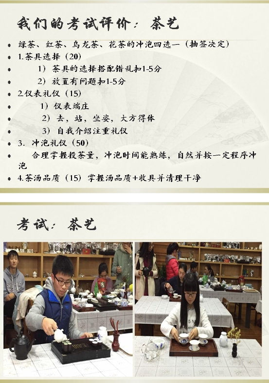 学生的学习热情与学习效果给了我们教师完善课程内容与改进教学方式的信心与动力。2014年开始,傅燕君老师和杨敏老师合开的《中学生茶艺》在原来课程内容的基础上增加了擂茶、青豆茶等民间特色茶的介绍;《中国茶知识与茶文化》课程中增加了乌龙茶与花茶的冲泡技艺的学习,课程改名为《茶艺与茶文化》,由杨敏老师和李燕老师合作开设。教师们不断总结经验教训,进一步完善课程讲义,使课程的目标更加明确,课程内容设置更加合理,根据实际情况减少了教师讲解、操作时间增加了学生练习、交流时间,课内推荐学生课后阅读有关茶文化相关书籍,进一步理解茶艺的程式与茶文化内涵间的关系,真正让学生学有所得所思,课程的评价体系也得到了学生的首肯。