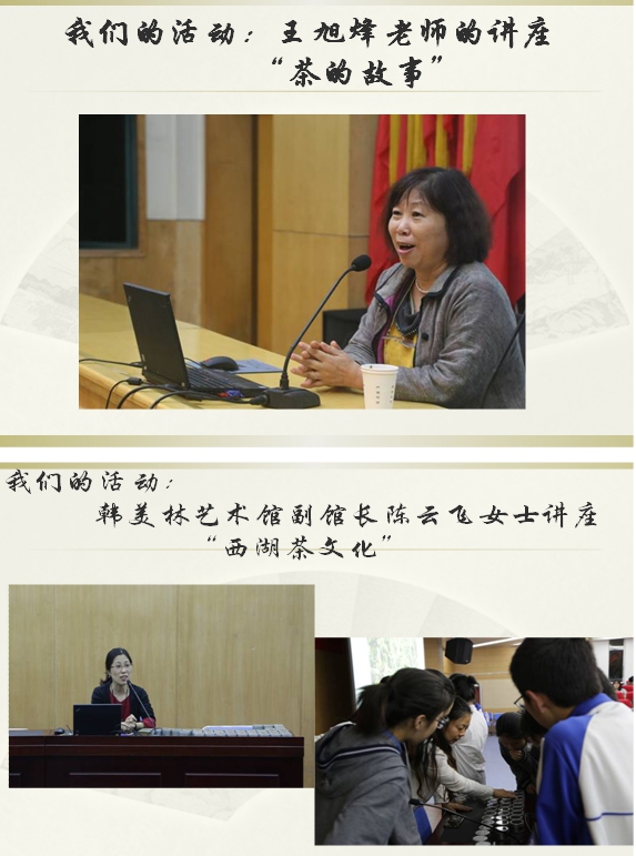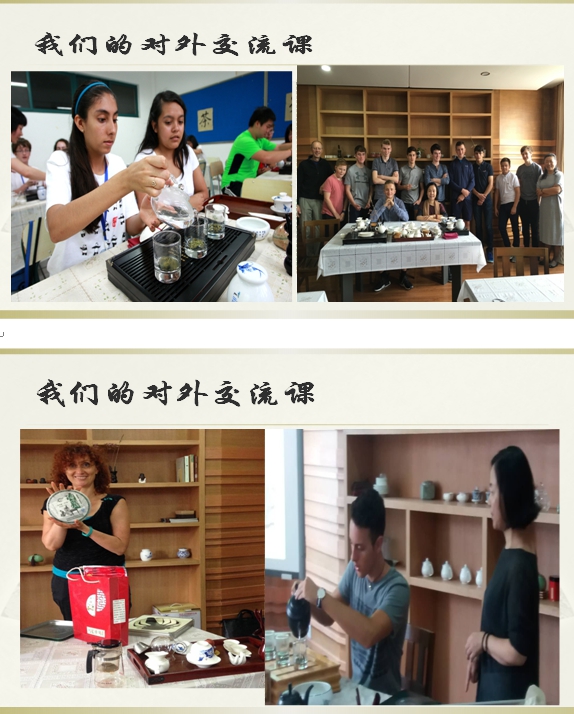 几年来,这两门课在学校选修课的抢课平台上一直是高一高二学生争选的热门选修课,先后有两百余名学生参加了其中一门课的学习,他们不仅拿到了2个选修学分,而且通过茶艺课茶文化课的学习,很多人爱上了喝茶,爱上了一片树叶的故事。就像高一4班的江南同学在交流中说的那样:“其实很感激茶艺与茶文化这门选修课,以前对茶的印象只是浮于表面,它很香,很好闻,喝起来有韵味。没想到它有这么深的比它的香味更加厚郁的内涵——它所传承的文化”。对茶艺茶文化感兴趣的学生越来越多,我们的学生甚至自己联系邀请了茅盾文学奖获得者、浙江农林大学茶文化学院院长王旭烽来讲“茶的故事”,邀请了韩美林艺术馆副馆长陈云飞女士来介绍“西湖茶文化”。他们了解并认可许嘉璐先生所说的 “茶文化是中华文化传播之一‘翼’”的观点,所以在与国外姐妹学校师生的文化交流中我们便看到了茶文化交流的场景。