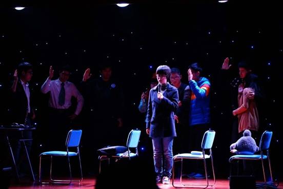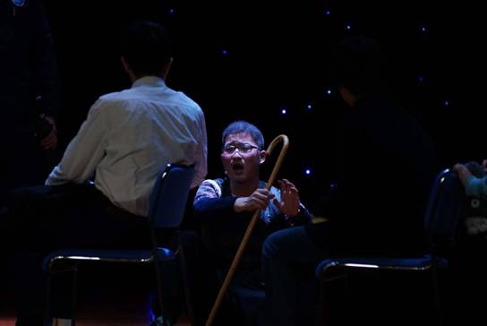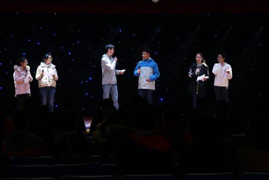 随后,便是中法班同学们为我们带来的原创情景剧《雨夜巴士》。他们经过一个月的磨合排练,在舞台上发挥内在,表现自我,从公交车上的不同乘客,不同角度,不同人物的争吵,和一场不合时宜的车祸,表现了一场荒诞绝伦的闹剧和一场难以预料的意外。中法班的同学们用他们的真情演绎和努力,感动了在场的各位,受到了观众的一致肯定。