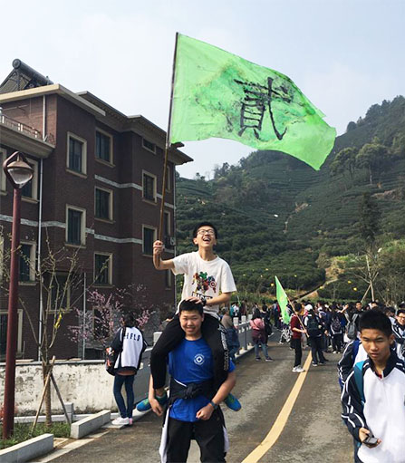 清晨,大家凭着一股初生牛犊不怕虎的冲劲儿,站在篮球场上,看各班一片彩旗飘飘,倒有几分出征的味道。出发了,同学们排着还算整齐的队伍依山而行,按捺不下激动的心情。然而大概走了1/3的路程,队伍就折了当时的锐气,有的同学汗流浃背,气喘吁吁。不得不佩服我们的班主任周美良老师,即使是行了一个小时左右的山路,也依旧是一副云淡风轻的样子,甚至放出“豪言”:“这点山路,负重一百斤也能走。”