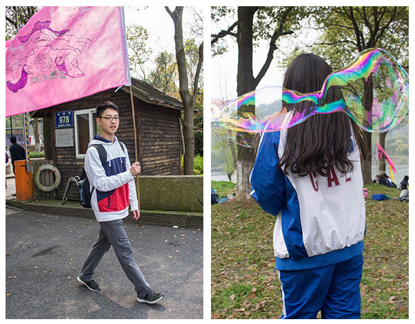 在湘湖景区,所有人都要沿湖一圈并到达学校统一集合点(并享受中餐+休息)。“徒步沿湖一周”听起来很累,不过,和朋友们不时聊着笑着跳着的我们一点也感觉不到吃力。大预班的学长学姐们精心准备的各式标志和美化招牌也给我们增添了前进的动力。一路上也不停有同学们掏出手机、相机,记录下美景和美景里的自己,于是用相机将时光定格,以期多年后再回首,也能从回忆里捞起这一方岁月静好。