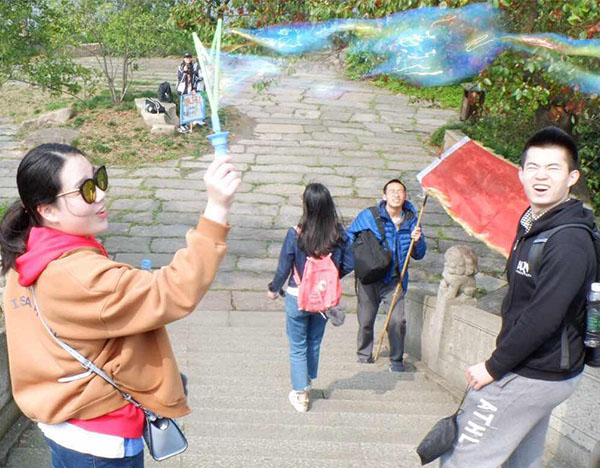 一路上,C班同学都兴奋异常,有和身边同学唠嗑吃零食的,有拿着蓝牙小音箱嗨歌的,也有举着手机不停自拍的,就连我们的随行外教Ms.Rosalina都激动得表演起了节目。经过大约两个小时的车程,我们顺利到达了美丽的湘湖湖畔。蓝色的班旗一扬,大部队就浩浩荡荡地走起来了。满目的苍翠,空气清新,灿烂的阳光照着红扑扑的脸蛋。同学们一路逛,一路吃,兴奋和喜悦浮现在每个人嘴角上。