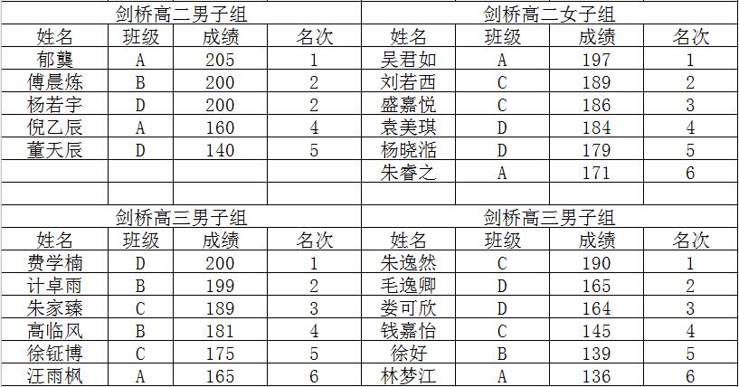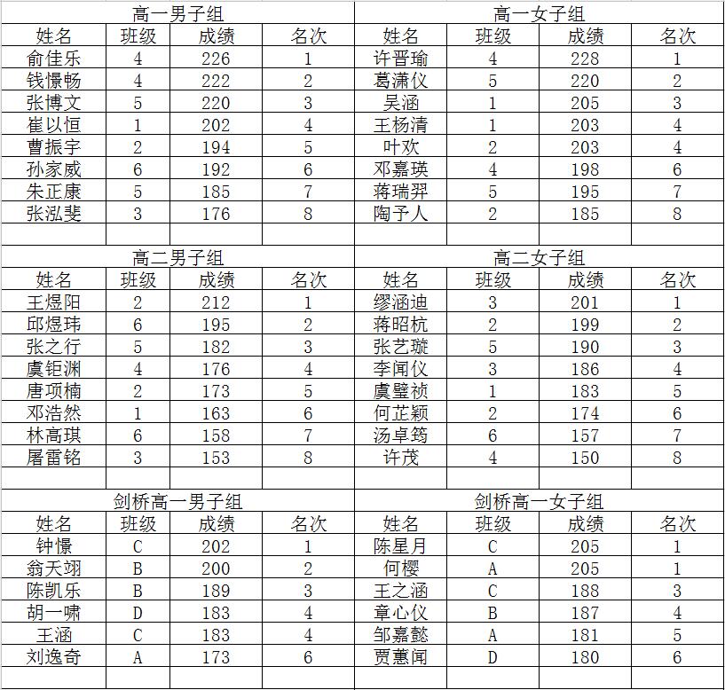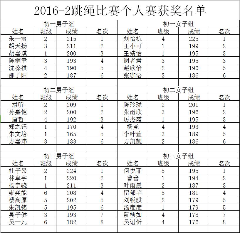 为使跳绳比赛如期举行,大预班和APU两个班级的同学克服了自身困难,经过好几轮的安排,才最终确定了名单和分组情况。他们多次和体育组老师沟通,准备好比赛所需要的各种表格,并事先接受了培训。在比赛进行的过程中,志愿裁判仔细、严谨地判定比赛成绩,认真工作。之后,两位主要负责的同学花了整整三节晚自习的时间整理了厚厚的一叠原始数据表。 大预班的金骁枫同学是志愿者负责人之一。他说:“虽然接到学校通知已经是周五了,时间非常紧张。但是在同学们的理解和支持下,我们一共提供了不下五十名志愿者,16组长绳裁判以及24组短绳裁判,并完成了本次活动的筹备和后续的统计工作。本次活动能顺利举行,我们都很开心。” 大预班 王扶桑 报道 附获奖名单: