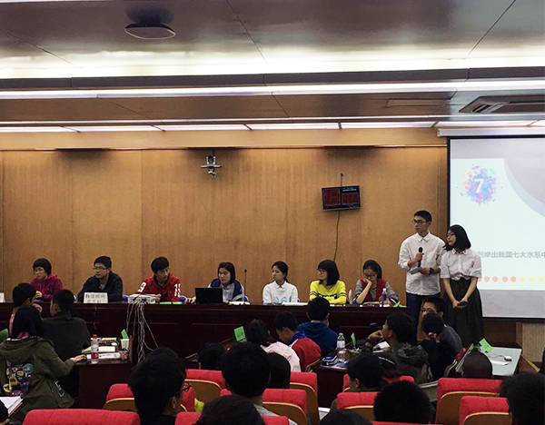韦家宝同学代表高一(5)班的解元、剑桥高二A班的许兴泽同学,展示了他们在过去的一年多里,在解学仁老师的指导下设计并制作的初期雨水处理装置。他从立项原因、项目实施、体会和感受三个方面作了介绍。