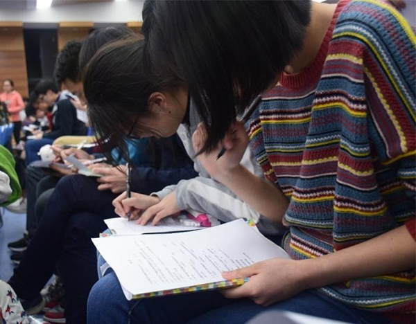 随后,比赛进入了大众答题环节。各班后援团的每位同学都被发到了一张试卷,他们需要在规定时间内各自独立完成上面的题目。根据后援团的答题情况,每班将会获得不等的加分,或者是获得复活本班第一环节被淘汰的选手的机会。大众答题环节的成绩还将影响下一个环节各班答题的先后顺序。