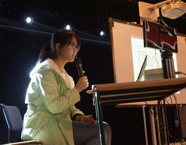 接下来,在志愿者批改试卷、统计各班得分情况时,高中组由高一的叶新怡同学和高二的韦家宝同学向大家展示了他们的课题研究成果。叶新怡同学比较了不同波长的灯光对文物损伤程度,并结合博物馆的实际需求设计了一款LED照明灯,她向大家详细介绍了她的研究过程,并且现场演示了她设计的LED灯。
