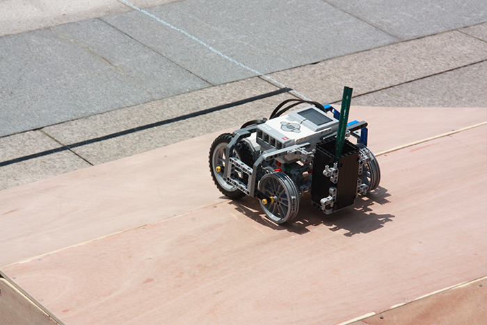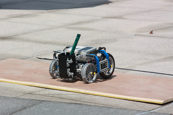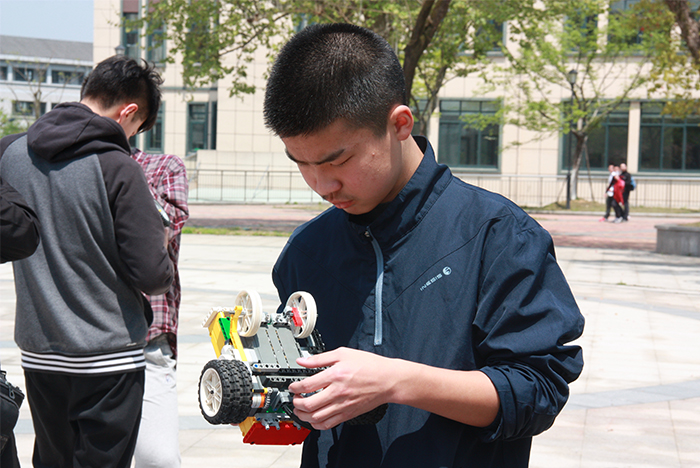 4月13日中午,我校在圆形广场举行了科技节“奔跑吧,铅笔”活动。这个比赛起源于科技节传统项目“奔跑吧,鸡蛋”,既呼应了今年“慎思明辨,格物致知”的活动主题,又为本届科技节增添了不一样的特色。本次为乐高机器人场地赛,参赛队伍利用乐高机器人的元件搭建一个小车,令小车从设定的起点运行到设定的终点。比赛场地分为直道、弯道、直道三段。赛道中设有四处障碍:两处凸起,一座拱桥,一道窄门。由于赛道为“U”形,且遍布障碍,乐高小车需要有一定的专项能力和路线规划能力。这对同学们来说无疑是一个不小的挑战。