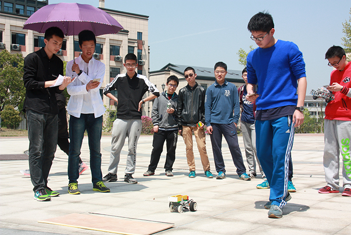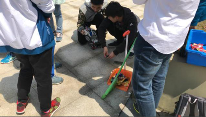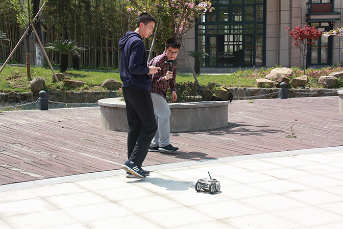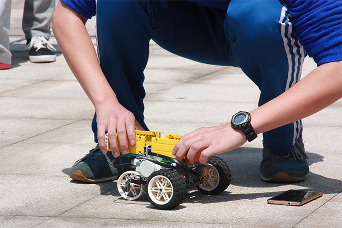 在正午日光的照射下,比赛如期举行。随着参赛选手逐一抵达场地调试装备,各队的设计也逐渐明晰起来。所有参赛队伍都采用了遥控小车的设计方案。显然,与其让小车自行分析地形、规划路线,不如由更善于观察,智力也更胜一筹的人类来进行遥控无疑是更好的选择。这样一来,小车结构设计和程序设计上的不同便构成了各组的区分度。