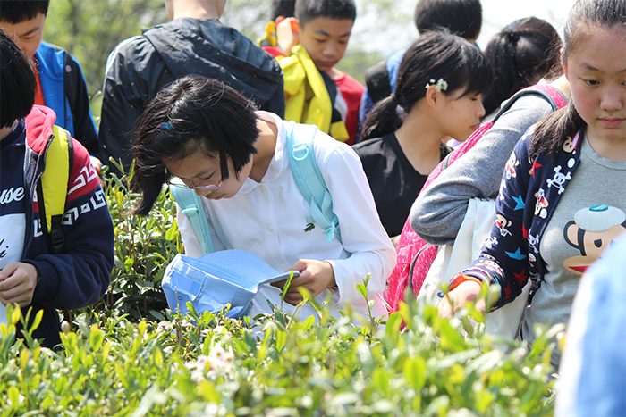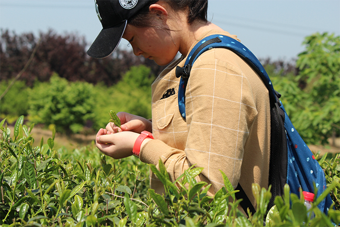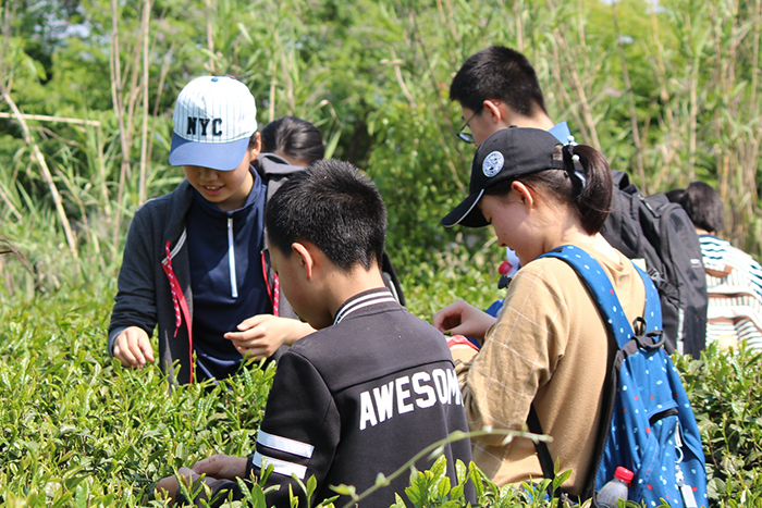 我们的第一项任务是富有浓浓文化气息的采茶。看到一大片绿油油的茶树,我似乎已经看到了一杯杯清茶,冒着氤氲的热气,几片茶叶在杯中沉浮。多么美的意境啊,我不禁沉醉其中。