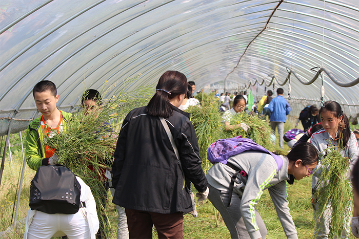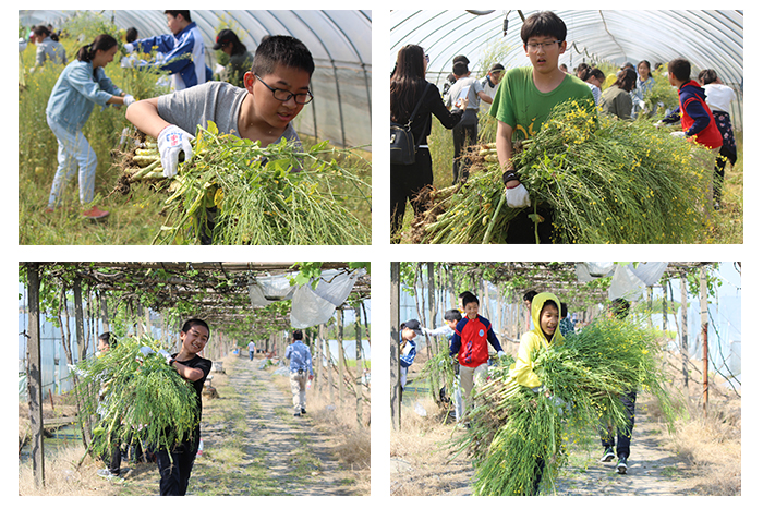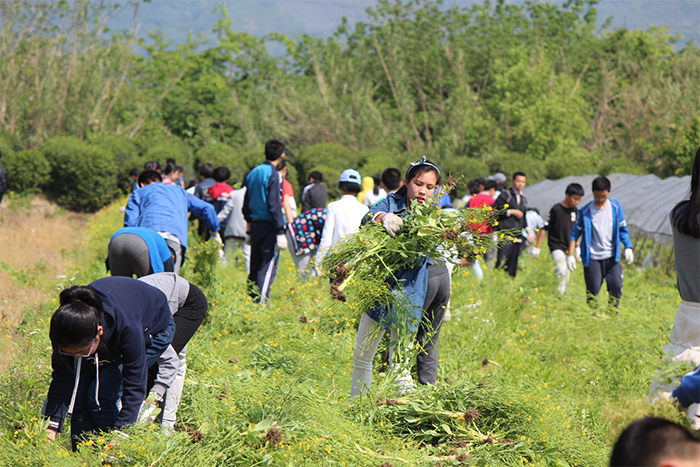 虽说有着种种困难,但大家的决心依旧很大,话不多说就开始拔起来。大棚里只有零碎的几声喊叫,剩下的只有同学们静默地、奋力地拔着油菜花。一株、两株、三株……越来越多的油菜花被拔倒,同学们的热情就像是忽然被点燃了似的,原本有些生疏的动作逐渐变得熟练,原先常常拔断了茎,现在是一把必定连根拔起;原先还怕被别人“误伤”,离得太近被别人随手扔下的油菜花打中,现在左手一把、右手一把油菜花,再小跑着前进,将一大束油菜花给堆在一起,再折返去拔地上的小草,一连串动作流畅到完全没有停顿。