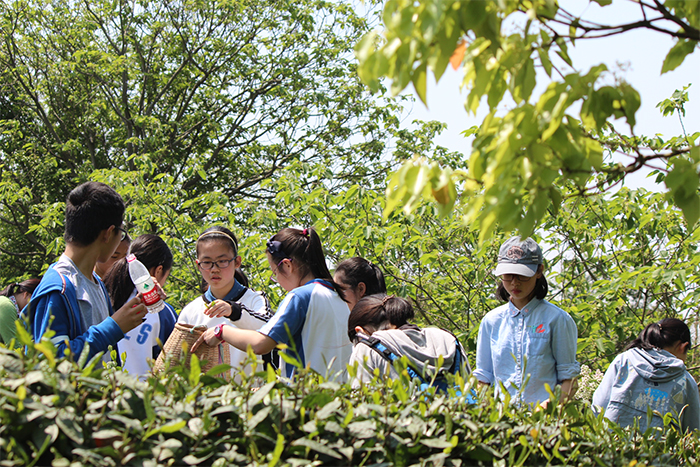 而第二项任务采茶可不比拔油菜容易,这是个细心的活儿。刚才拔油菜的疯子们顷刻间又成了心灵手巧的采茶者,我们背起竹篓,融入了那一片茶色,那一片茶香。翠叶怀抱着淡青的嫩芽,一个个微小的“两叶一心”的目标在扶疏的枝叶中几乎难以发觉,仿佛和我们在玩着捉迷藏。班主任林老师催着我们赶紧采,我们笑称林老师“站着说话不腰疼”,给疲累的劳动添了几分乐趣,最后在我们的调侃之下林老师也加入了采茶的行列。茶叶的芯子是娇嫩的,嫩绿中带着鹅黄,仿佛掐得出水。茶独有的馥郁气息轻柔地游走于每个人的鼻尖,那香气仿佛也是梦幻般的淡青色。我偷偷摘了一片茶叶细细嚼着,第一口是满嘴的苦涩,第二口就是萦绕在唇齿间久久散不去的醇香,混杂着茶叶的清凉。这仿佛就像我们学农一样,再苦,再累,也终究是令我们难忘的,令我们快乐的。
