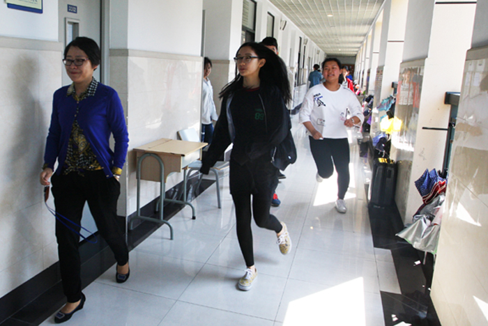 9点28分,“警报”响起,各班级的任课教师,迅速组织各班学生,按照指定的线路,快速有序地疏散到校园田径场。在整个过程中,学生们紧张有序、临危不乱,演练全程用时2分55秒,全校1800余名师生安全到达指定地点。