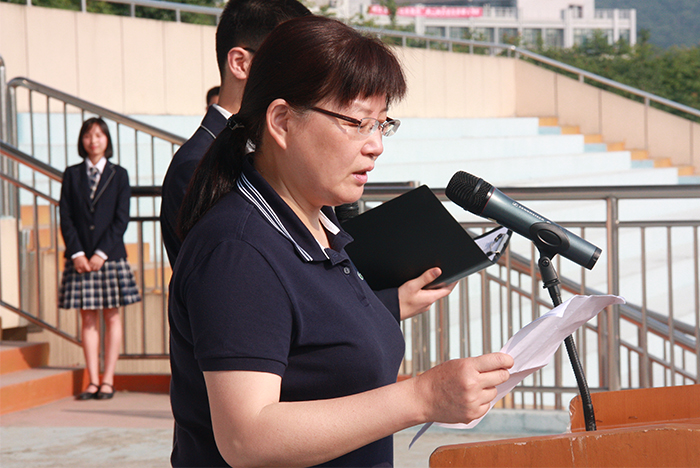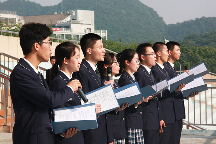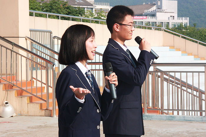 开幕式上,高三同学分别用中、英、德、法、日、西语六国语言深情并茂地朗诵了鲍勃•迪伦的名作《答案在风中飘扬》,并清唱《We are the world》,展现了他们的人文关怀以及对世界、人生的思考。