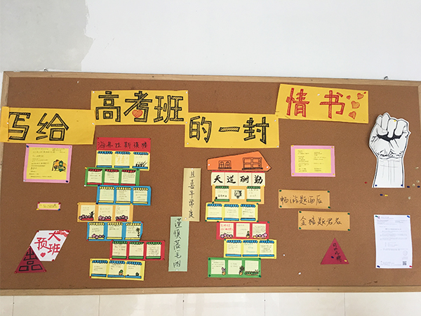 高考服务组率先抛砖引玉。虽然任务相对简单,但展板布置、内容设计凝结着组员们的心血,如古诗摘句、名人名言等环节旨在达到娱乐性、实用性统一的目的,集体赠言饱含了三年同窗的温暖。他们想传达这样的理念:大预班的同学将一直与高考生同在。
