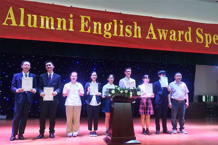 最后2班、4班同学带来的歌舞表演,诙谐的编曲,高亢醇厚的高音,引来同学们会心一笑、慨叹羡慕。最后由杭外校友董佳尉先生宣布了本次校友杯得主,分别为来自初三(6)班的吴一凡同学(男)和来自出初三(3)班的邓晨钰同学(女),并为他们颁发了奖杯,至此本届校友杯英语演讲比赛画上了圆满的句号。