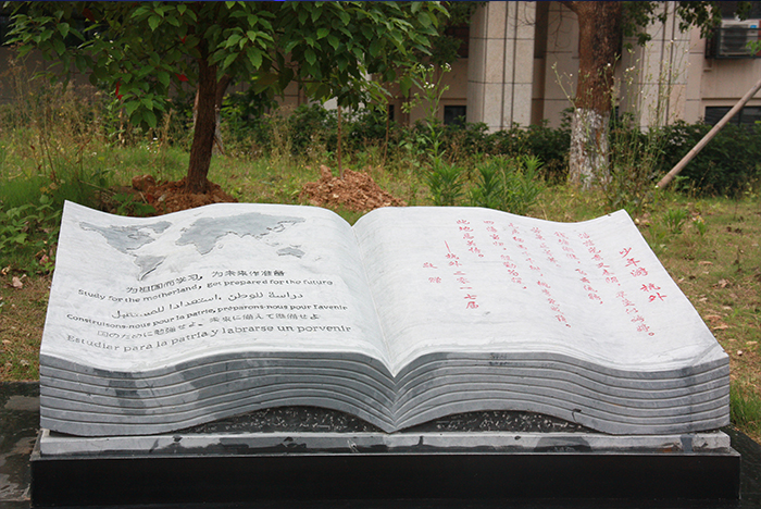 有人说杭外人骄傲排外,我想说杭外孩子谦逊而不自傲,自信而不自大,这应该是和大量优秀者同行的结果吧。不得不承认,英语确实是杭外人的骄傲,给了这个学校以标志。但英语并不是杭外唯一的标志。杭外的孩子,其实是有共同的语言体系的:乐观向上的心态,真诚宽容的修养,直面挫败的勇气,敢于梦想,崇尚合作。哪怕站在世界巨人的面前,也能保持灵魂和人格的独立性。看看同学们自己设计创作、寓意深刻的毕业赠礼——青石雕刻而成的书型石雕吧,这——才是杭外的语言。杭外不可复制。
