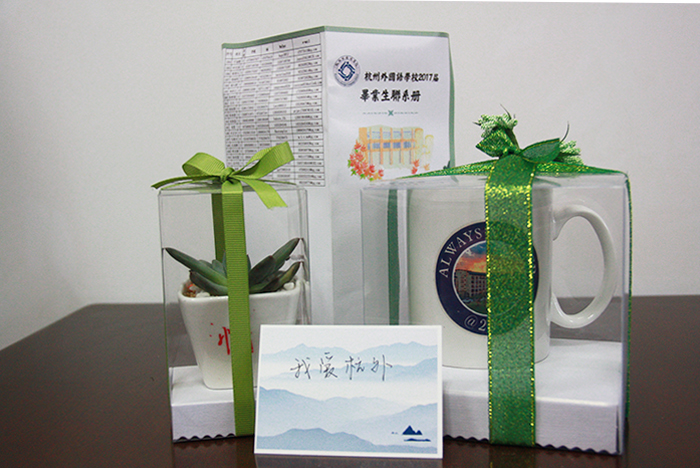 为表达对母校的深情厚意,2017届毕业生向学校赠送了一座青田雕刻而成的石雕书,寓意“读万卷书,行万里路”。方健文校长、徐继彬书记代表学校接受赠礼,并希望同学们在未来的人生道路上能够继续发扬杭外的精神。毕业生代表还向学校领导、教师赠送了自己设计的马克杯、毕业生联系册、多肉植物及小卡片以作纪念。