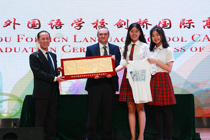2017年6月9日下午15:00,杭州外国语学校剑桥高中2017届毕业典礼在学校体艺中心隆重举行。校长方健文、党委书记徐继彬、副校长夏谷鸣,剑桥高中学术校长Mathew Thomas等领导出席仪式。毕业典礼由高三学生主持,剑桥高中全体师生以及部分高三学生家长参加了本次活动。