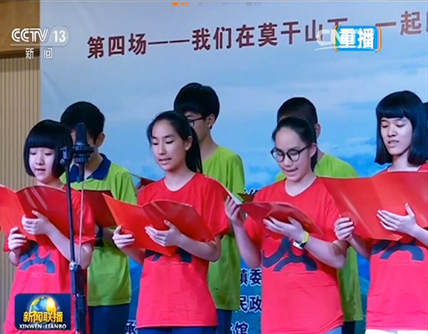 我校暑期社会实践小队在莫干山镇“之江新语”朗读者大舞台活动中表演的《走进大山》诗朗诵活动在昨日(7月1日)中央电视台“新闻联播”节目中播出。此次活动由我校学生和莫干山中心学校的联谊同学共同完成,为此次莫干山探访活动划上了圆满的句号。