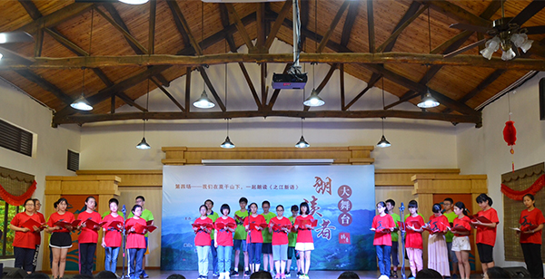 为了更好地融入莫干山镇中心学校的生活,充实我们的实践,当天下午,杭外的同学们和莫干山镇中心学校的八位同学组成了一个诗朗诵团,一同参加了在镇新农村大礼堂举办的“《之江之声》朗诵比赛第四场”。作为学生特别团队,虽然只有不足1小时的准备时间,但在大家共同的努力下,学生团队的节目《走进大山》赢得了人们的掌声和好评。