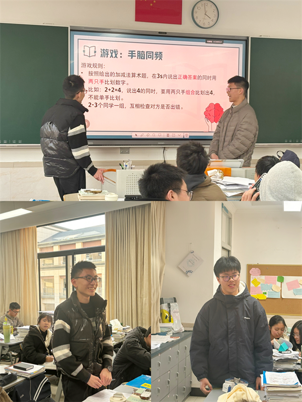 本次主题班会,首先以“手脑同频”游戏开篇:同学们3秒内抢答算术题并双手比划答案,保证两只手数字之和为算术题答案,考验手脑同频。教室里抢答声与笑声交织,大家在趣味互动中体会到多感官联动对大脑活跃度的提升作用。
