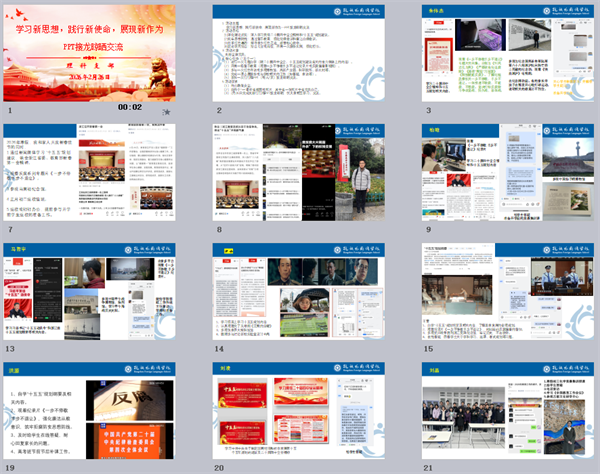 2月26日,支部党员按照要求每人制作1页PPT,在钉钉群开展接龙活动,晾晒成果促进交流,互学互鉴共同提升。PPT中,党员们清晰展示自身专题自学、警示教育、红色寻访、志愿服务的成果与感悟,既有理论学习的心得体会,也有实践活动的影像记录,还有结合岗位工作的思考规划。通过线上晾晒、相互学习,党员们交流经验、分享感悟,在思想碰撞中凝聚共识,形成了“比学赶超、争先创优”的良好氛围,进一步推动了理论学习与教育教学实践的深度融合。