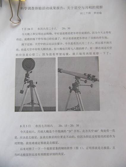 暑假中,初三同学组织开展了科学调查体验活动。这次实践活动的内容有:动、植物生长和月相、星空等观察体验活动以及“我的节水生活” DV调查活动。确定了目标后,同学们以小组形式纷纷开始探索之旅。